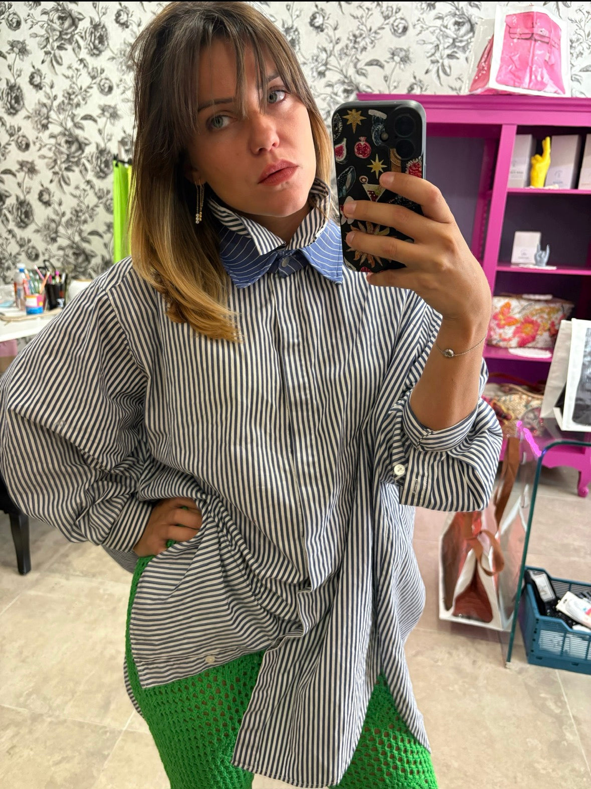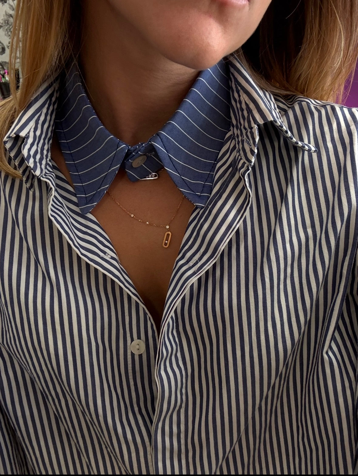 Ce col amovible à rayures bleu marine se glisse sur n’importe quelle chemise, pull ou t-shirt pour upgrader ta tenue en une seconde. On adore son effet double col structuré, son jeu de rayures contrastées et son style boyish-chic ultra couture.